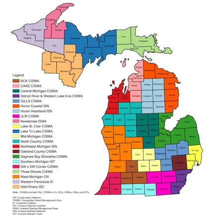 There are 22 CISMAs in Michigan, covering every county in the state. Saginaw Bay CISMA was founded in 2017 under the Michigan Invasive Species Grant Program (MISGP), covering 16 counties within the Saginaw Bay Watershed. In 2019, Saginaw Bay CISMA was split into 3 CISMAs: GiLLs CISMA, Central Michigan CISMA, and the new Saginaw Bay CISMA to better serve these areas. Since then, we have been providing invasive species information and partnership opportunities for 6 counties in the Saginaw Bay Region: Arenac, Bay, Huron, Saginaw, Sanilac and Tuscola.